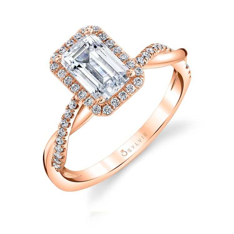 Emerald Cut Modern Halo Diamond Spiral Engagement Ring - Coralie